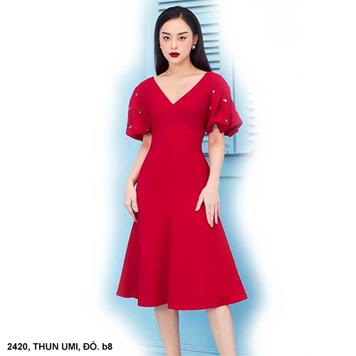ĐẦM XÒE TAY NGẮN DÚN ĐÍNH HOA HỒNG BÊN EO - 2421 Mã số : 2421