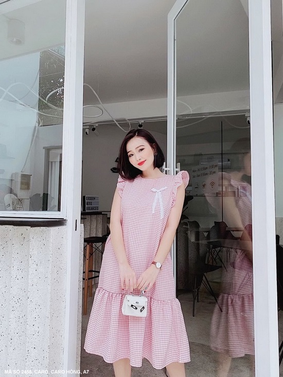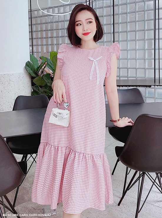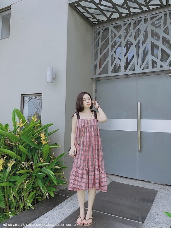 ĐẦM SỌC CARO 2 DÂY CỘT NƠ VAI-2459