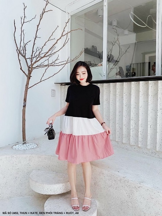ĐẦM XÒE TAY NGẮN PHỐI 3 MÀU XINH XẮN - 2452