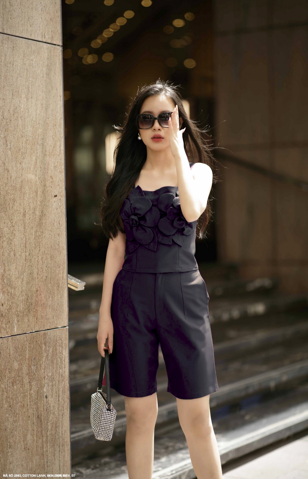 BỘ SHORT CỔ VEST VAI XÉO ĐÍNH NGỌC TRAI - 2571