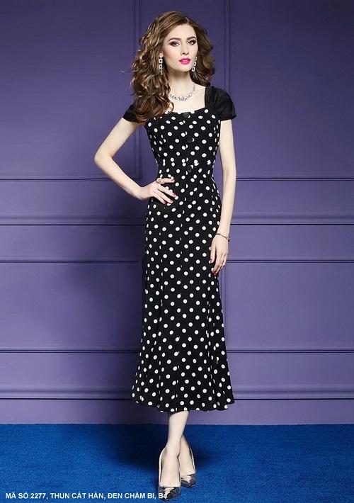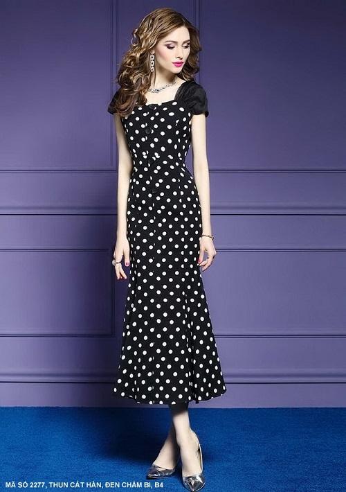 ĐẦM CHẤM BI TAY RÁP LĂNMã số : 2277Loại vải : Thun Cát HànMàu : Đen Bi Trắng