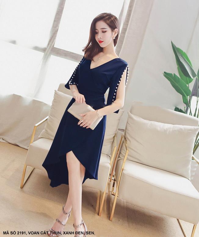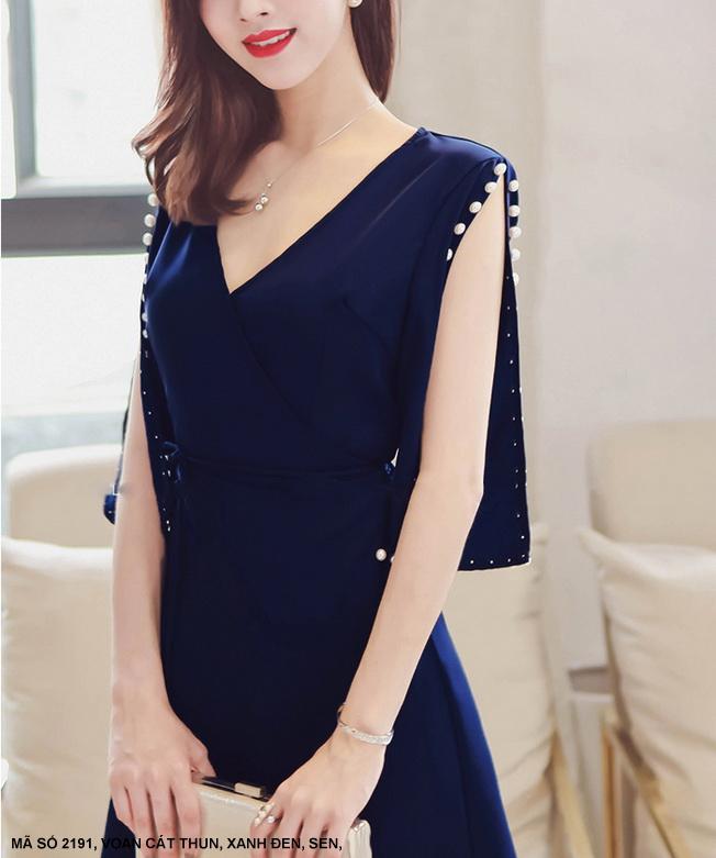 ĐẦM CỔ CHÉO TAY LỞ ĐÍNH HẠT NGỌC TRAIMã số : 2191 Màu : Xanh Đen, SenLoại vải : Voan Cát Thun