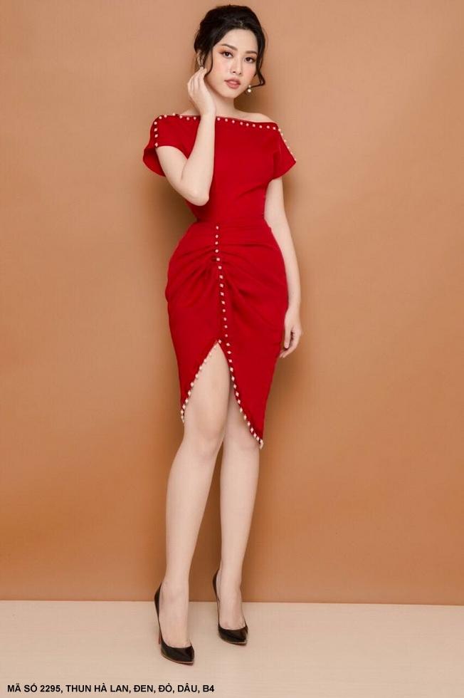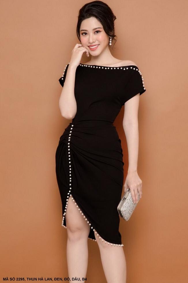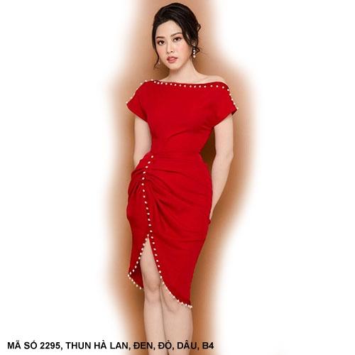 ĐẦM CỔ RỘNG LAI XÉO ĐÍNH HẠT BẸTMã số : 2295 Chất liệu : Thun Hà LanMàu : Đen , Đỏ , Dâu
