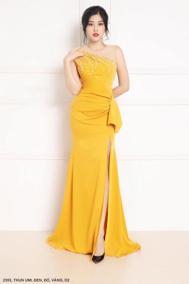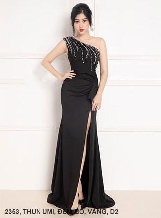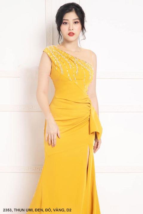 ĐẦM DẠ HỘI MỘT VAI CHÉO XẺ TÀ THẮT NƠ EO ĐÍNH NGỌC TRAI Mã số : 2353Chất liệu : Thun UmiMàu : Vàng , Đen , Đỏ