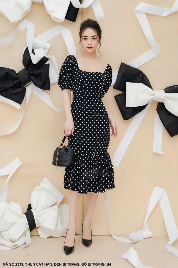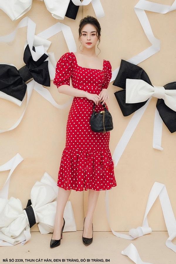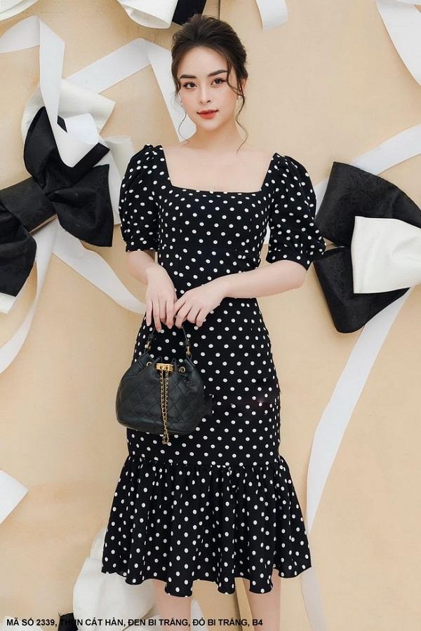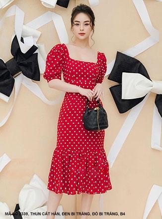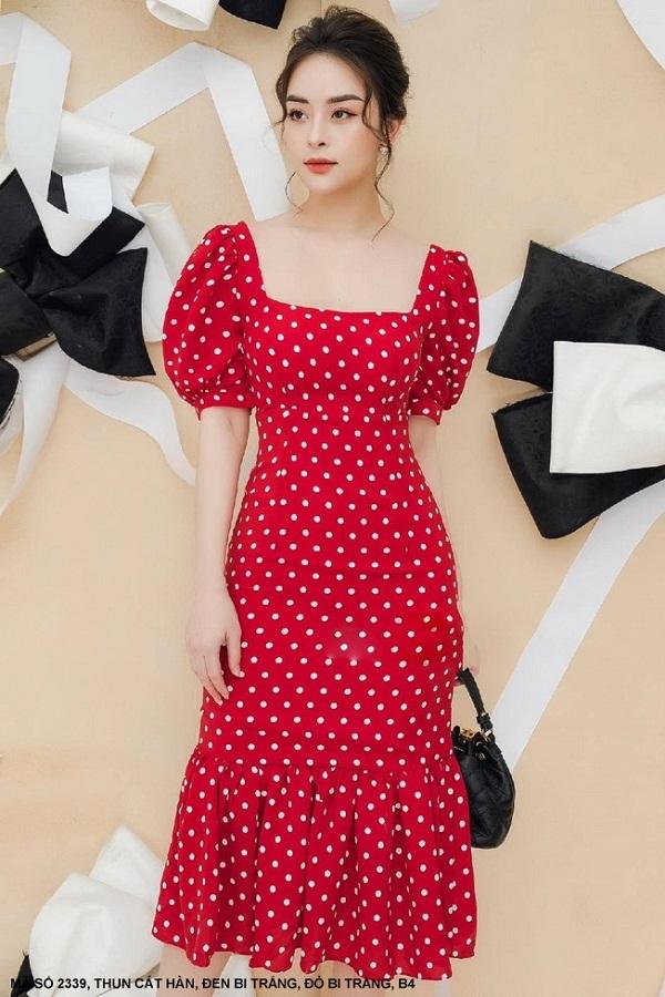 ĐẦM ÔM CỔ VUÔNG TAY NGẮN LAI DÚNMã Số: 2339Chất liệu : Thun Cát HànMàu: Đen Bi Trắng , Đỏ Bi Trắng