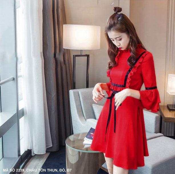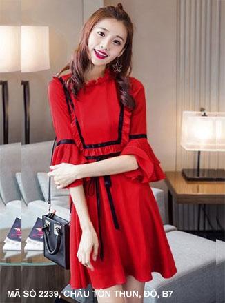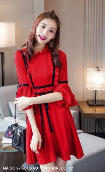 ĐẦM PHỐI VIỀN CỘT NƠ EO TAY LỞMã số : 2239Loại vải : Châu Tôn ThunMàu : Đỏ