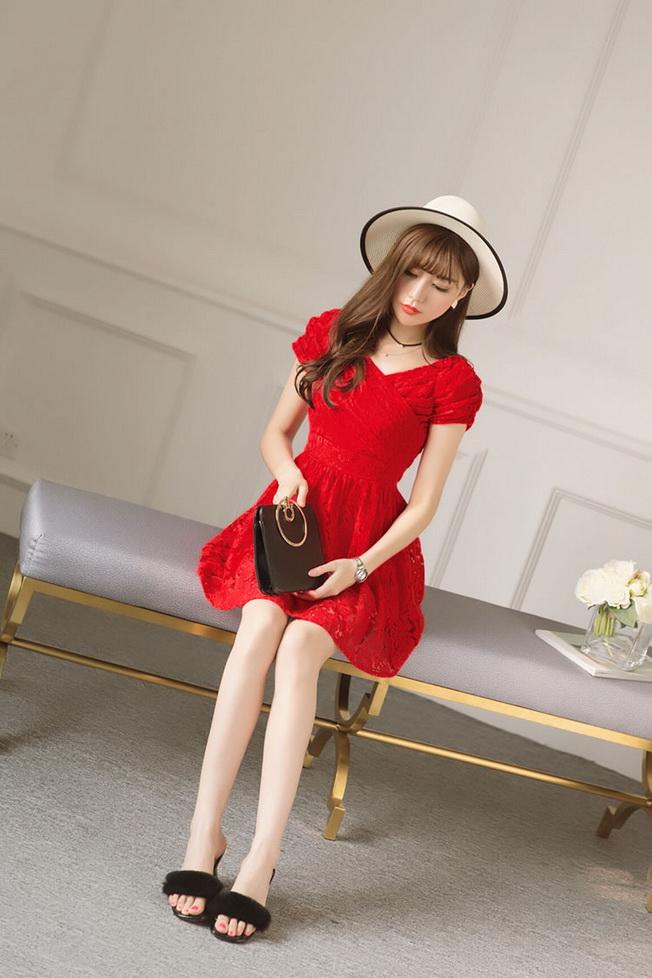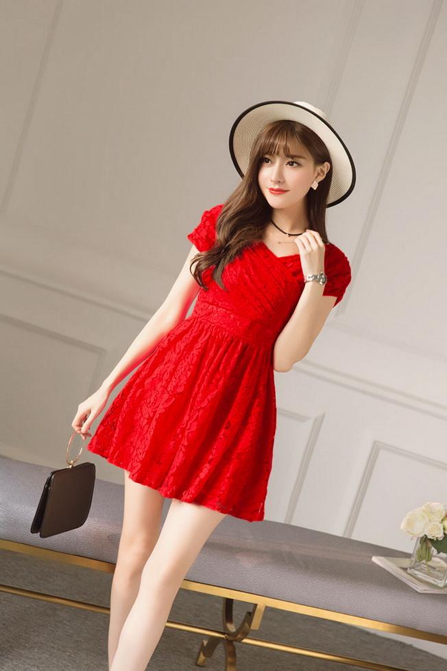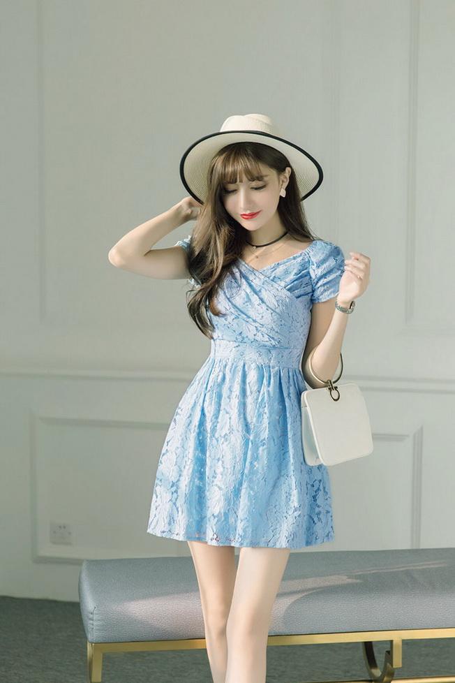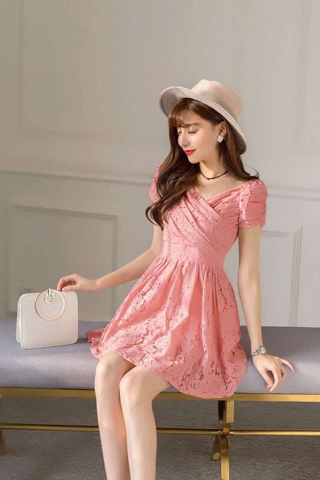 ĐẦM REN CỔ CHÉO XINH XẮNMã số : 2085Loại vải : Ren Cao CấpMàu : Hồng Dâu, Xanh Biển, Đỏ