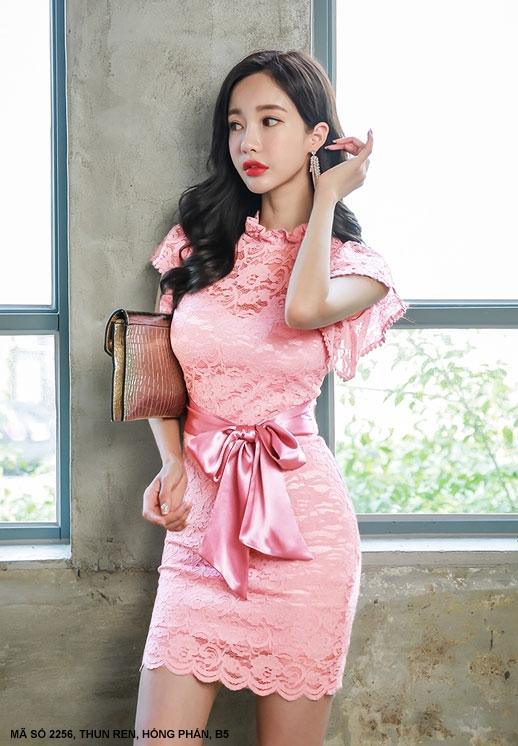 ĐẦM REN THUN CỘT NƠ EOMã Số: 2256Màu: Hồng PhấnLoại vải: Thun Ren