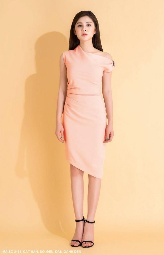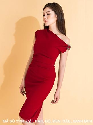 ĐẦM SÁT NÁCH CỔ XÉO ĐÍNH KHOEN EO DÚNMã số : 2198 Loại vải : Thun Cát HànMàu : Đỏ Đô, Đen, Dâu, Xanh Đen