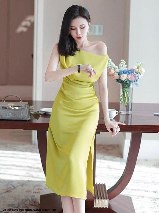 ĐẦM SUÔNG VAI RỚT 1 BÊN QUYẾN RŨ - V200Mã số : 2589Chất liệu : PHI THUNMàu : Vàng Chanh
