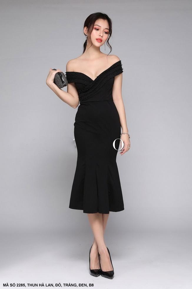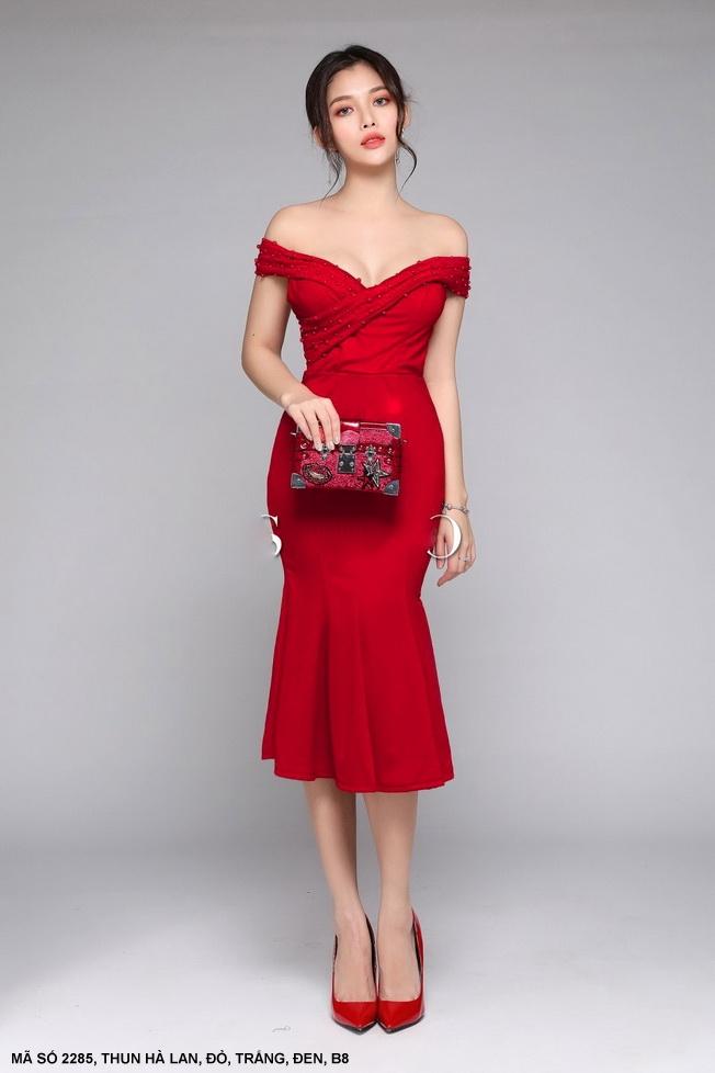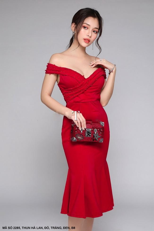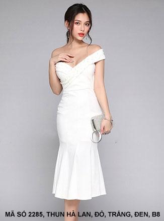 ĐẦM TRỄ VAI LAI XẾP LY Mã số : 2285Loại vải : Thun Hà LanMàu : Đỏ, Đen , Trắng