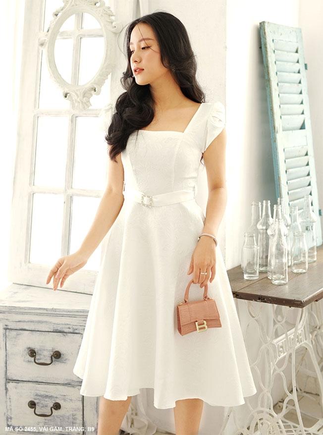 Sản Phẩm MaDe In Việt NamHàng Shop Cao CấpĐẦM XÒE CỔ VUÔNG TAY NGẮN THẮT NƠ LƯNG - 2455Chất liệu : Vải GấmMàu : Trắng