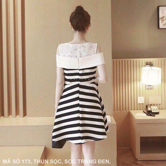 ĐẦM XÒE SỌC PHỐI REN Mã số : 173Loại vải : Thun Sọc Và RenMàu : Sọc Trắng Đen